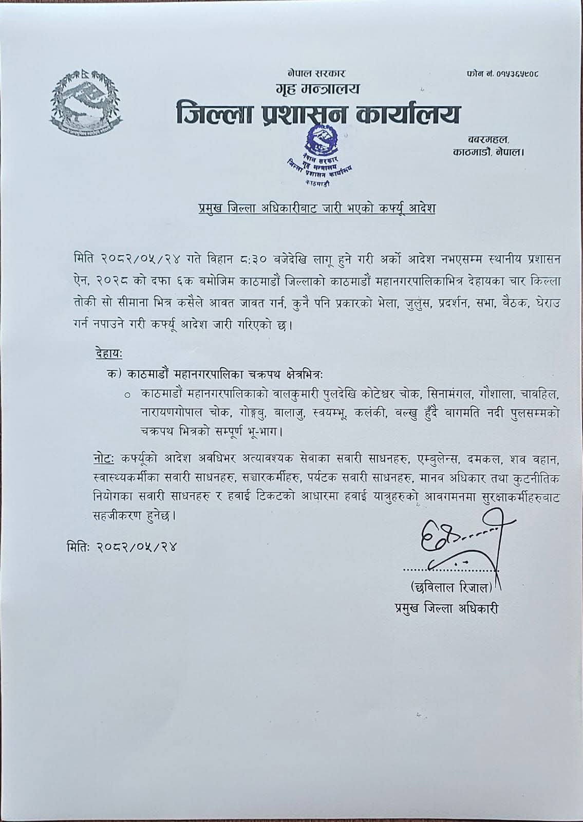 प्रमुख जिल्ला अधिकारीको आदेशानुसार काठमाडौं महानगरपालिकाको बालकुमारी पुलदेखि कोटेश्वर चोक, सिनामंगल, गौशाला, चाबहिल, नारायणगोपाल चोक, गोङ्गबु, बालाजु, स्वयम्भू, कलंकी, बल्खु हुँदै वाग्मती नदी पुलसम्मको चक्रपथ भित्रको सम्पूर्ण भू-भागमा कर्फ्यु लागू गरिएको छ।